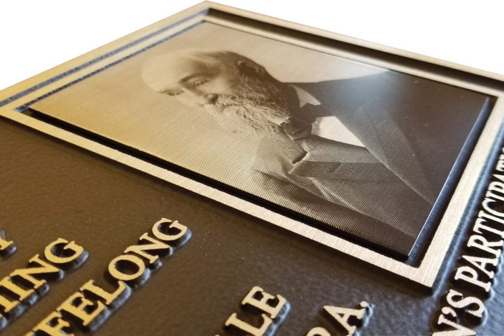 Etched plaques use acid or laser etching for fine details, perfect for rendering logos, detailed images, or small fonts.